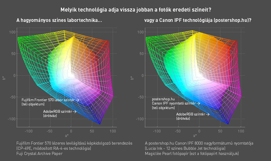 A fotópapírra történő nyomtatás esetén, a hagyományos ezüstalapú papírképekénél jóval nagyobb színtér reprodukálása lehetséges (ahogy a lenti összehasonlító ábrákon látható), és még a matt festővászon esetében is hasonló a kiaknázható színtér, mint a hagyományos labortechnika esetében. Ez a gyakorlatban azt jelenti, hogy a postershop.hu-nál fotópapírra nyomtatott képek színei jobban hasonlítanak a képernyőn látható színvilághoz – illetve a valósághoz -, és a kontraszt is nagyobb, mint a fotólaborban kidolgoztatott papírképeké.